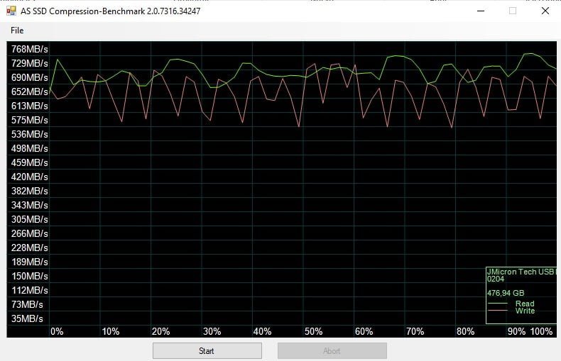 Bajo la interfaz USB 3.1 Gen.1 de nuestra placa base Asus Maximus VIII Gene con puerto USB 3.1 Gen.2, el TeamGroup PD1000 nos ofrece un rendimiento en escritura y lectura secuencial bastante alto, aunque algo alejado de los resultados que podemos tener bajo interfaz USB 3.2 Gen.2. Es curioso que un disco duro externo pueda tener unas tasas de transferencia más altas que un disco duro interno por interfaz SATA3.